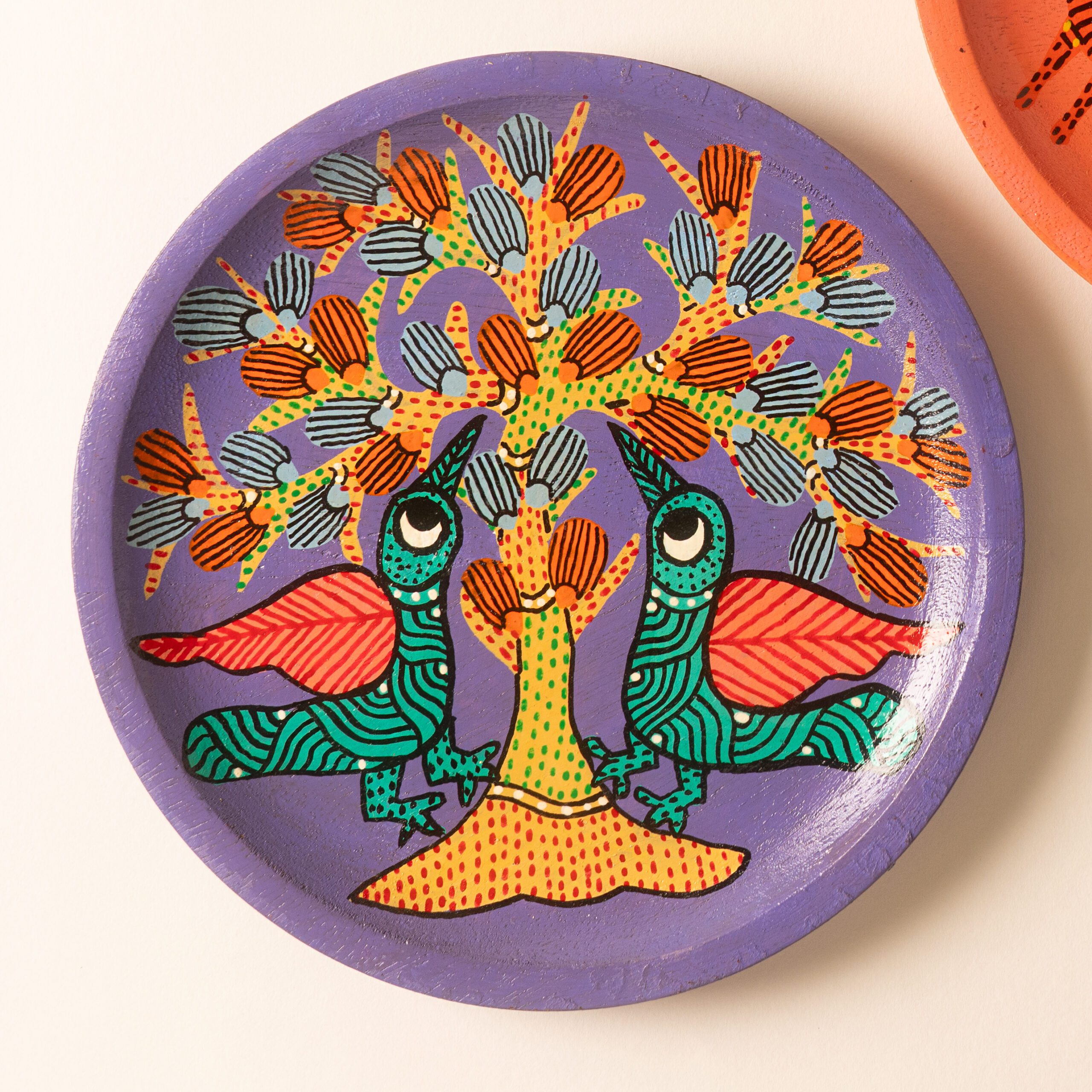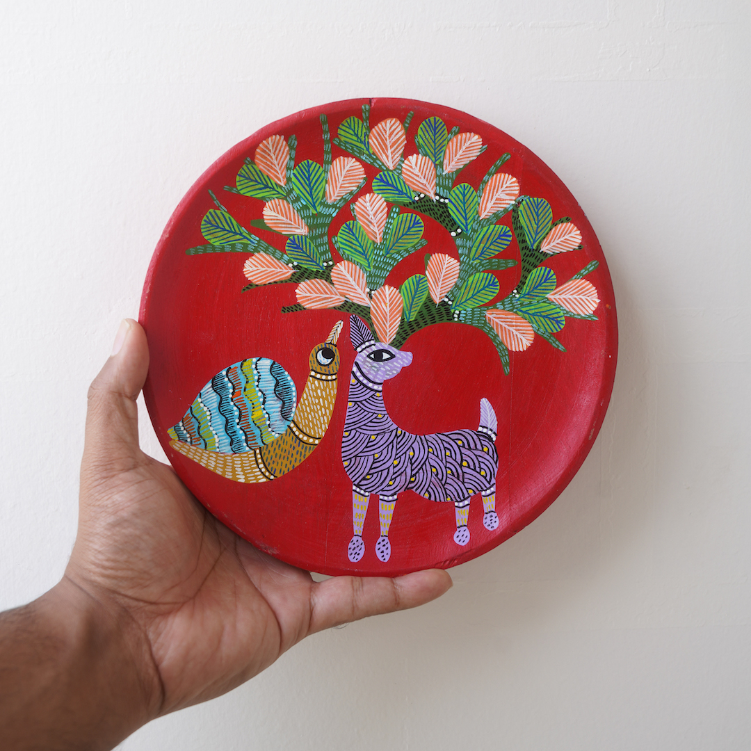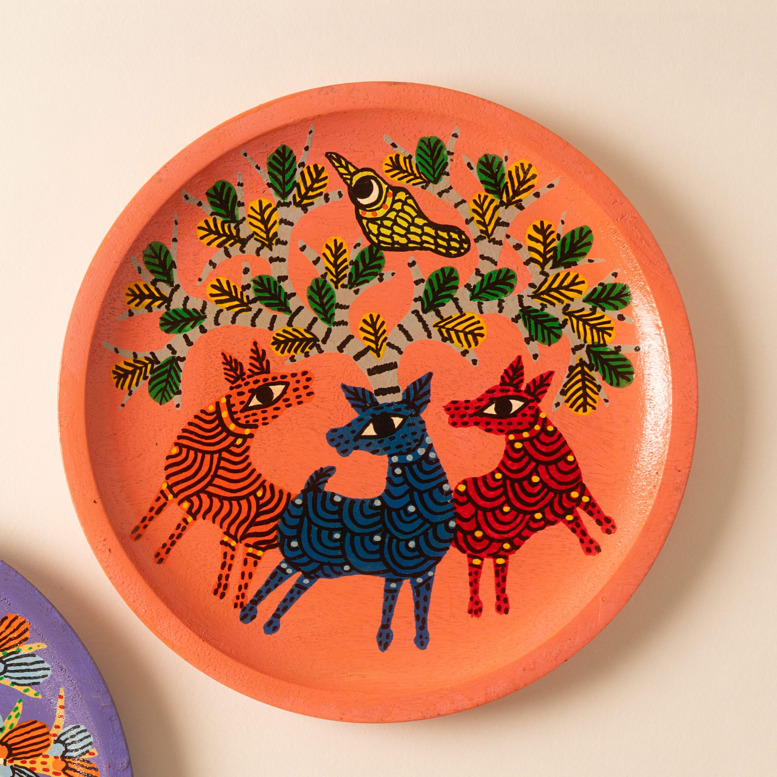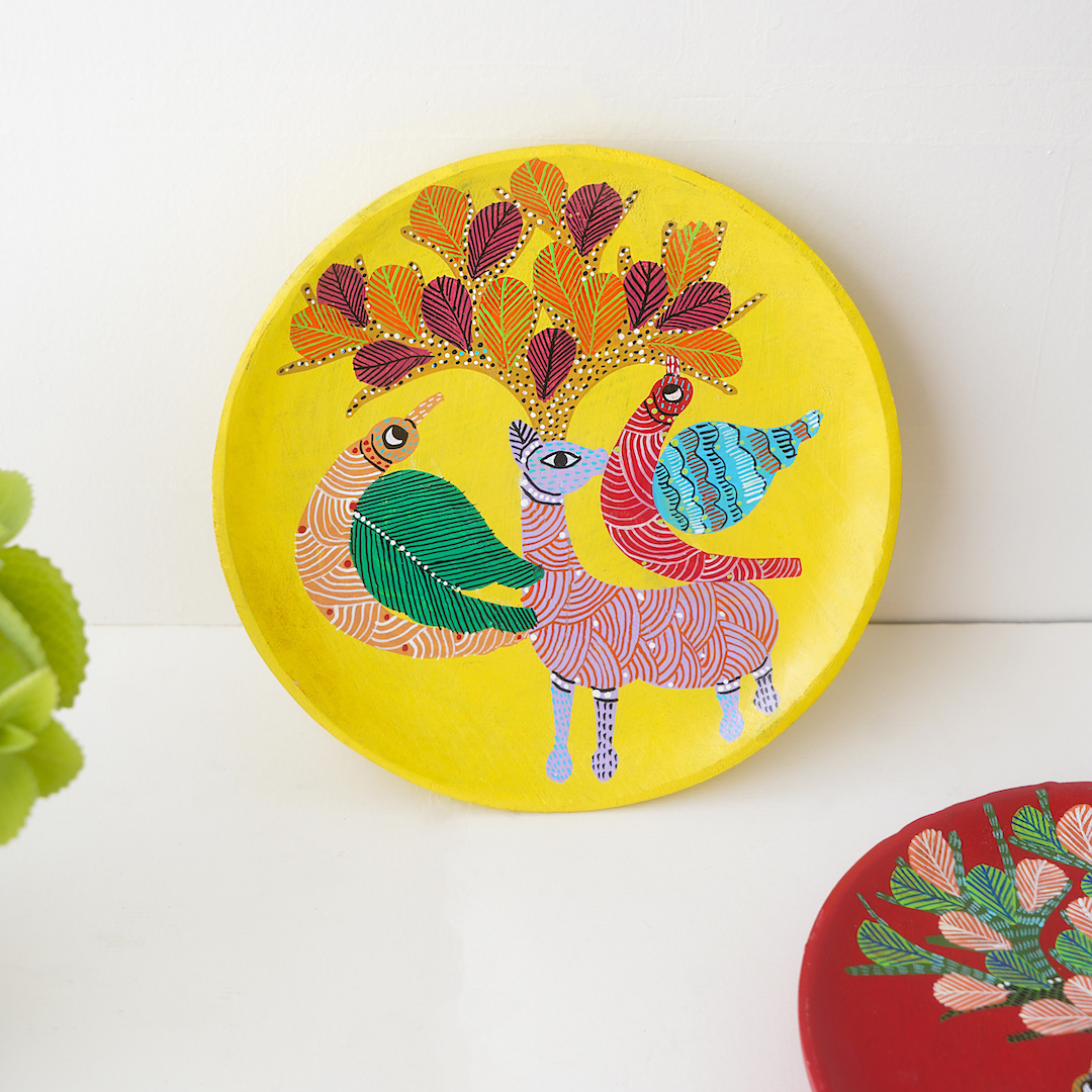 Handcrafted from rich Saharanpur wood and intricately painted by Gond tribal artist Lileshji, this vibrant plate celebrates India’s living traditions. A stunning piece of handmade decor from India, it makes for a truly unique and meaningful Indian crafts gift.