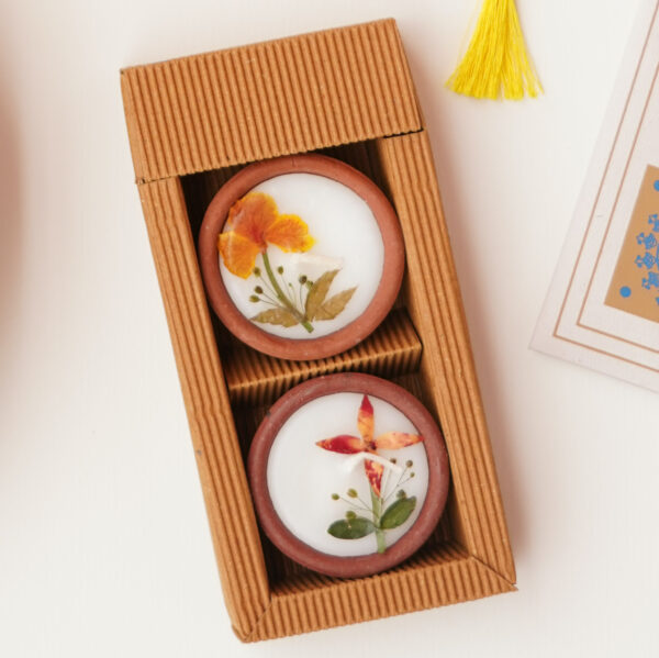 Bring home a glow of tradition with this pair of terracotta pot candles, each hand-poured with assorted fragrances and embellished with dried flowers. Crafted in natural terracotta, these 5.5 cm candles radiate rustic charm while filling your space with soothing aromas. Perfect for festive décor, gifting, or mindful moments, they celebrate artisanal beauty while adding warmth, fragrance, and elegance to every occasion.